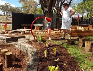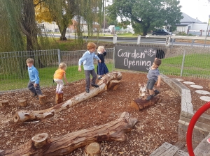 The front garden now provides an inviting entrance, open grass area for running and ball sports, stepping stone paths through sensory gardens and vegetable plots where surplus produce is on offer for parents to enjoy. The northern garden has a deck area for outdoor eating and learning, a sunken timber play area with fiddle-stick stepping logs, a slippery slide (recycled), wet-dry creek bed and ponds for water play and a mud kitchen for very messy play. The pre-school was formally opened in May 2017 and it 'was a wonderful opportunity to celebrate our fabulous upgraded garden and outdoor play space.'