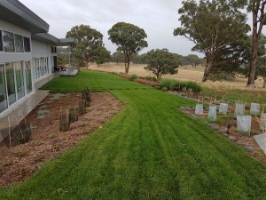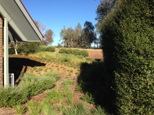 To respond to the modern architecture an Australian bush garden encloses the house and lawns. The ribbon like pathways through the bush garden allow one to enjoy the wider countryside setting and provide a botanical experience where different species of natives have been grouped together. Extensive soil remediation/ improvement was carried out and careful plant selection to ensure the garden would thrive in the medium-heavy clay soil. Mature tree planting in the courtyard, a sunken Japanese style garden and vegetable plots provide other elements of intrigue within the garden.