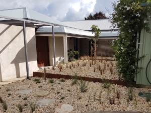 Living Edge Design was commissioned to create a stronger entrance and arrival, whilst incorporating a new building into the garden setting. Steep level changes and the client's interest in Australian plants resulted in a native bank planted with grasses and bird-attracting shrubs. Further projects have included creating a designated trampoline area which is screened and softened with planting and native cottage gardens.